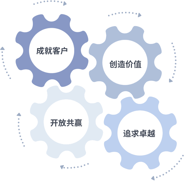 成就客户是一切决策的出发点,,创造价值是衡量所有工作的标准,,,,追求卓越是我们做事做人的态度,,,,开放共赢是我们的格局也是最终的结果。。。。价值观的齿轮环环相扣,,推动着组织里的每个人不断向前。。。